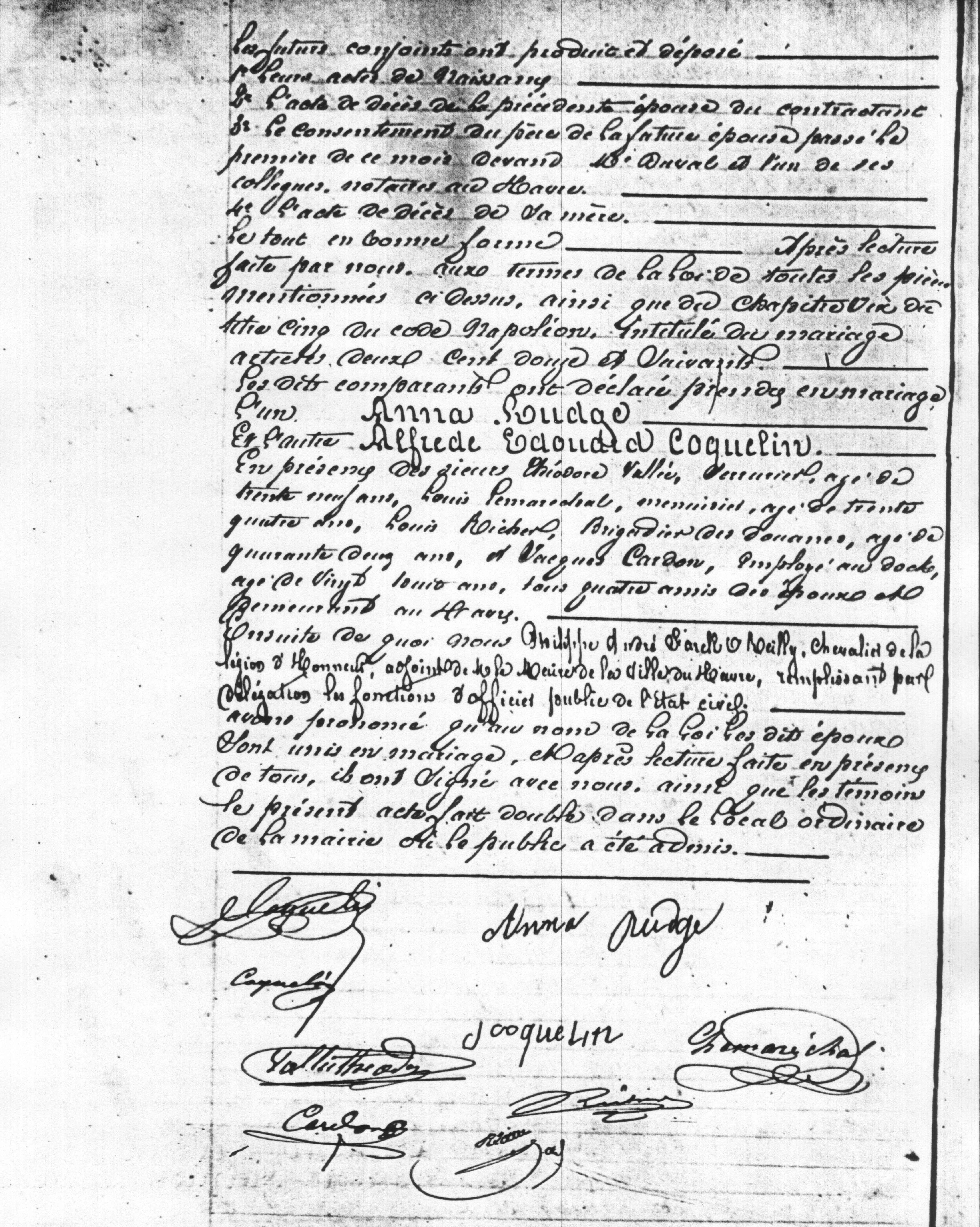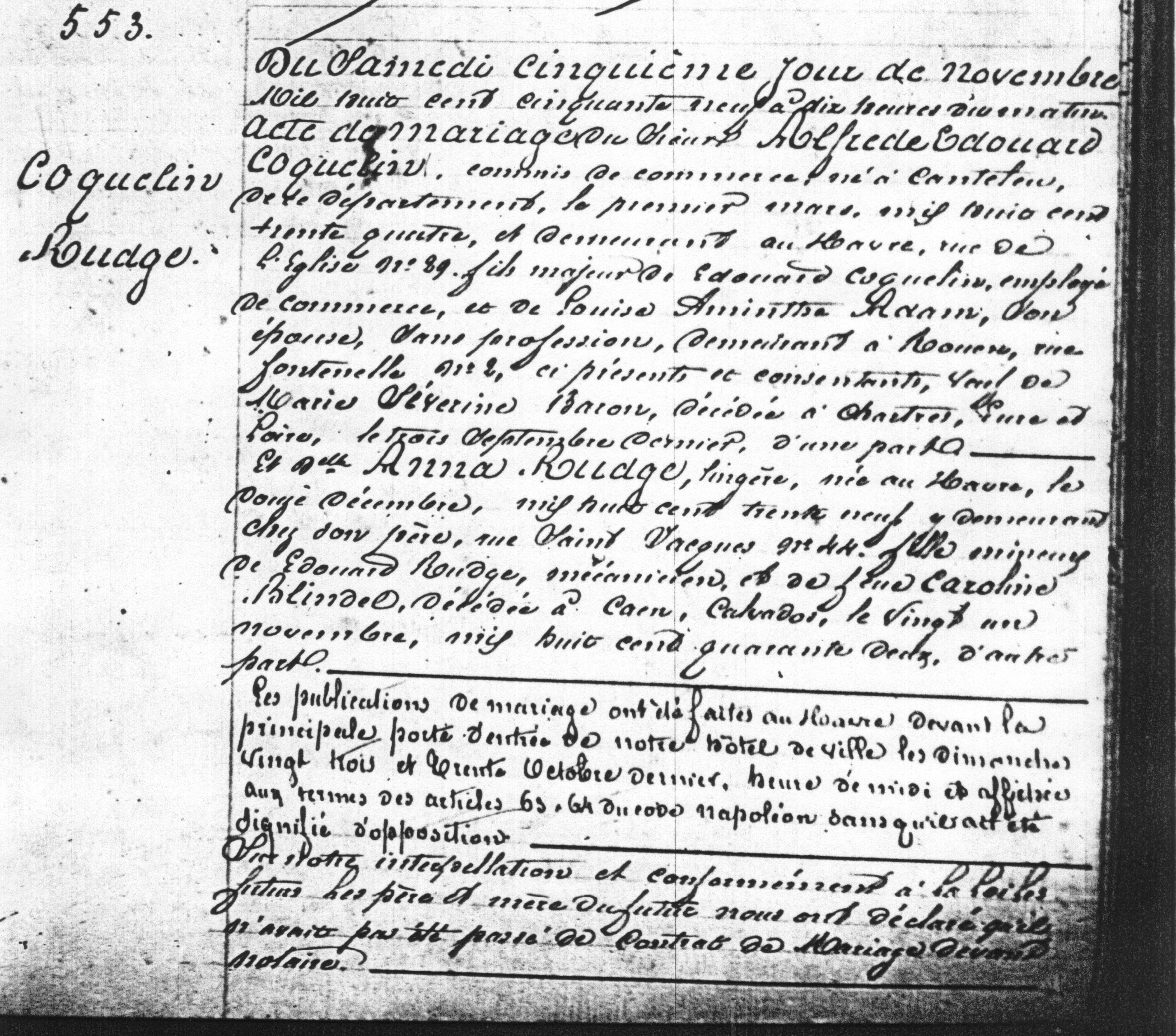 "No. 553 Coquelin Rudge On the fifteenth day of November one thousand eight hundred fifty nine at ten in the morning Act of marriage between Sir Alfrede Eduoard Coquelin, assistant shopkeeper, born in Cantelon of the same department, on the first of March one thousand eight hundred thirty four and dwelling in Le Havre, Church street No. 89, adult son of Eduoard Coquelin, shop employee and of Louise Aminthe Adam, his wife, unemployed, dwelling in Rouen, Fountenelle Street No. 2,, here present and consenting, widow of Marie Seyerine Baron, who died in Chartres, Eure and Loire, the thirteenth of last September, on the one hand- And of Anna Rudge, washerwoman (?), born in Le Havre, on the twelfth of December, one thousand eight hundred thirty nine and dwelling at her father's house, 44 Saint Jacques Street, minor daughter of Edward Rudge, engineer, and the late Caroline Blindell buried at Caen, Calendos, the twenty first November, one thousand eight hundred forty two, on the other hand. The publications of marriage were posted at Le Havre in front of the front doors of our town hall on Sunday the twenty third and thirtieth of last October at noon and in accordance with articles 63 and 64 of the Napoleanic code without any objections [?]. On our interpretations and in conformity with the bride and groom, their parents declared to us that the marriage contract was signed before a notary public. The future couple produced and deposed the following: 1. Their records of birth. 2. A record of the death of preceding wife of the groom. 3. A letter of consent by the father of the future wife signed the first of the present month, M. Duval and one of his colleagues, notaries at Le Havre 4. A record of the death of his mother. A common bond was formed [?] After we read the terms according to the law and all of the documents mentioned above, after Chapter Ten of the fifth title of the Napoleanic code title of marriage articles two hundred twelve and following. The two were declared to be joined in marriage The one: Anna Rudge And the other, Alfrede Edouard Coquelin. In the presence of Theodore Vallie, thirty nine years, Louis Lemaredeal, age thirty four years old, Louis Richer, Brigadier, forty five years old, and Jacques Cardon, employee of the docks, twenty eight years old, all four friends of the groom and living in Le Havre. Then Phillip Girard Sarek et Neilly, Chevalier of the Legion de Honor, adjoint of the Mayor of the city of Le Havre appeared before us, complying with the obligatory functions of state officials. We have pronounced in the name of the law the spouses are joined in marriage. After reading this in the presence of all, they signed with us and the witnesses present, done on behalf of the mayor's office and his administration. Coquelin Anna Rudge Coquelin Jooquelin Lemaredeal Cardon Richer"