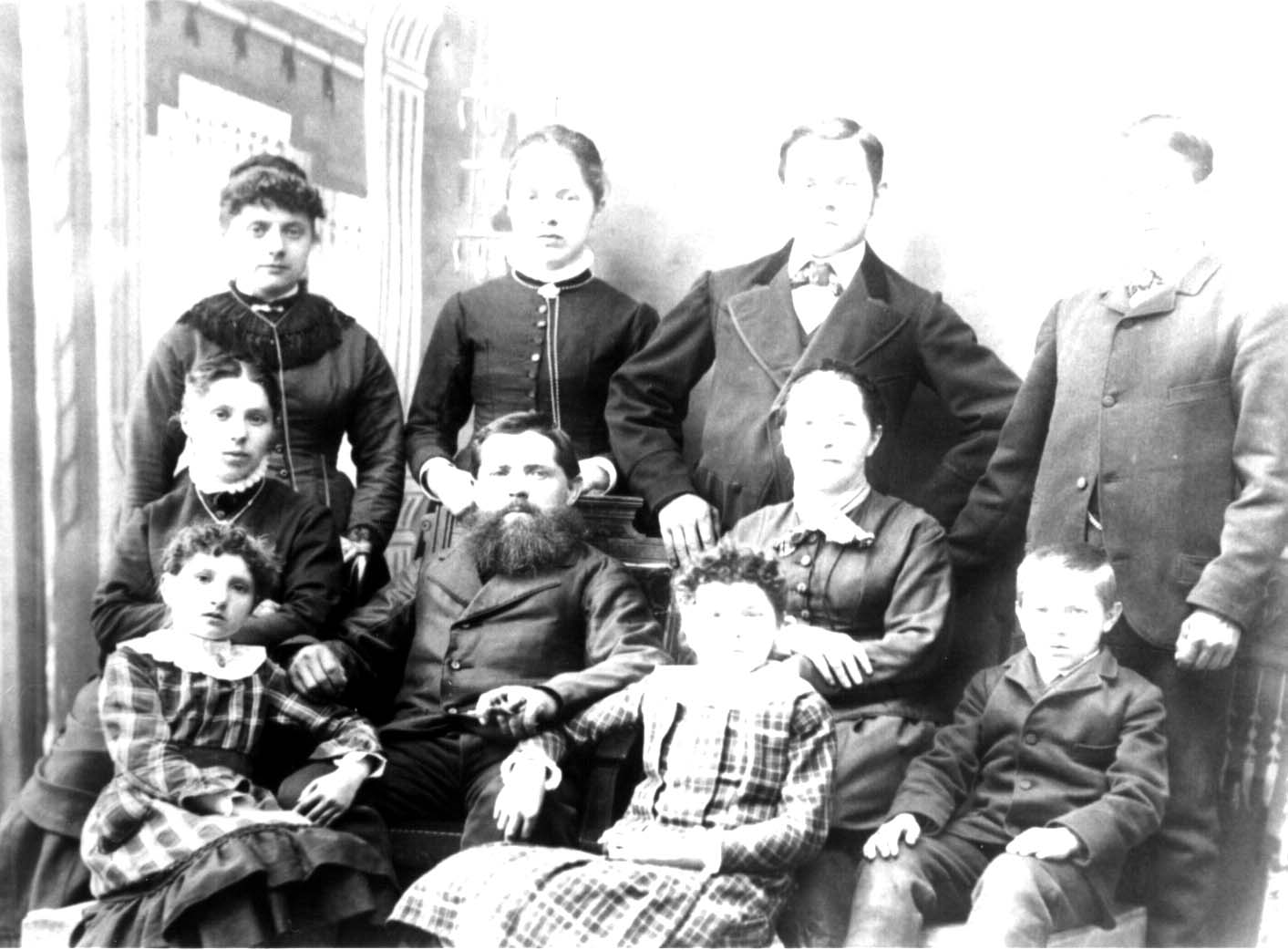 Here's a photograph of Johannes and Elizabeth nee ROTH BIERI and their six children, probably taken in Switzerland. The individuals in the photograph have been identified as follows: Back and standing: Elizabeth BIERI, Susanna BIERI, John BIERI, Christian BIERI; Middle: Anna BIERI, Johannes BIERI, Elizabeth nee ROTH BIERI, Karl BIERI; Front: Fanny BIERI and Rosa BIERI.
