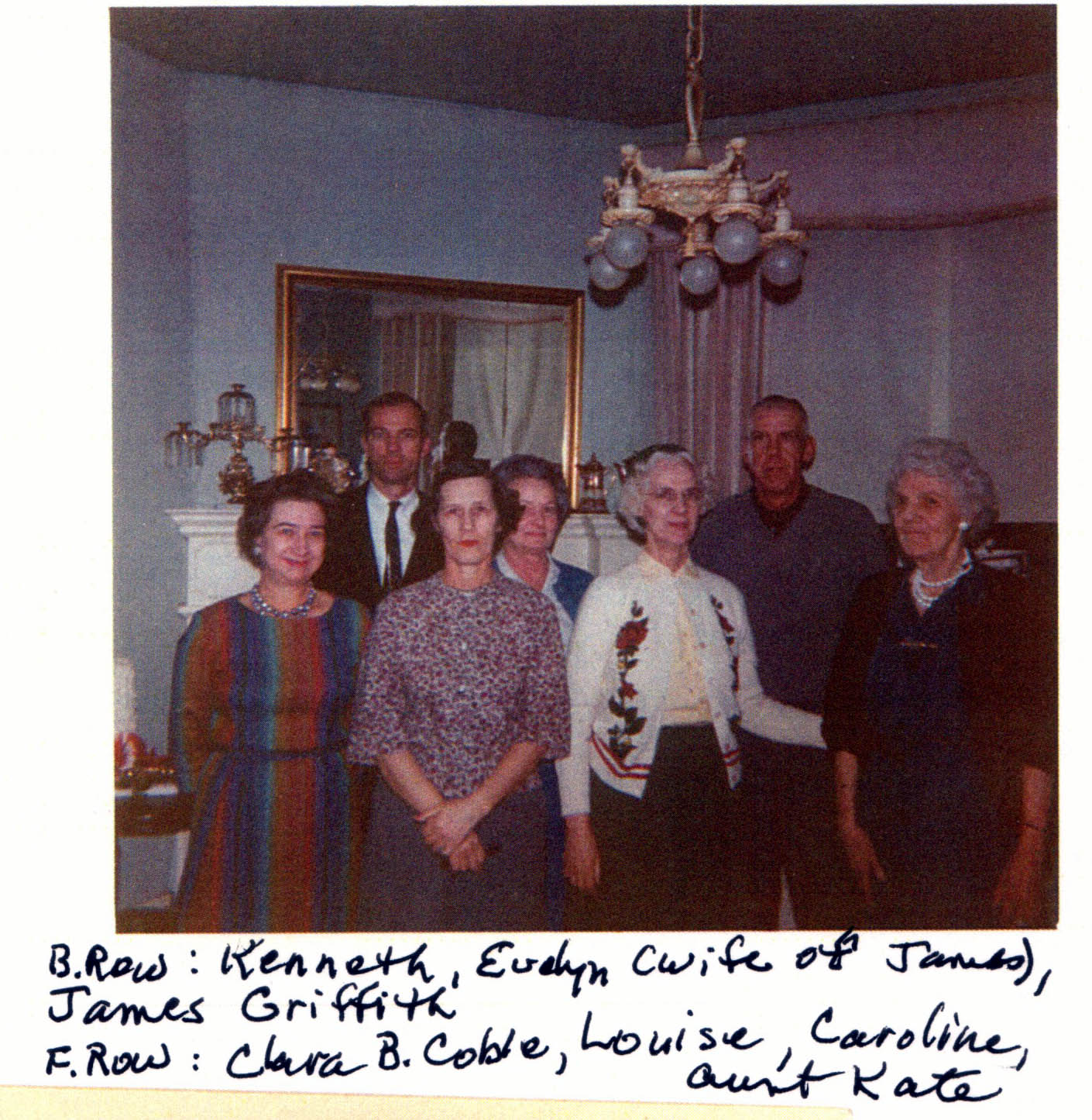 Here's a photograph taken ca. 1962 of the Griffith family with some Coble relatives. Back row, left to right: Kenneth Rudge Wilson Jones, Evelyn nee Snyder Griffith, James T. Griffith Jr.; Front row, left to right: Clara nee Bivens Coble, Louise nee Coble Bareford, Caroline nee Coble Jones, Kate nee Rudge Griffith.