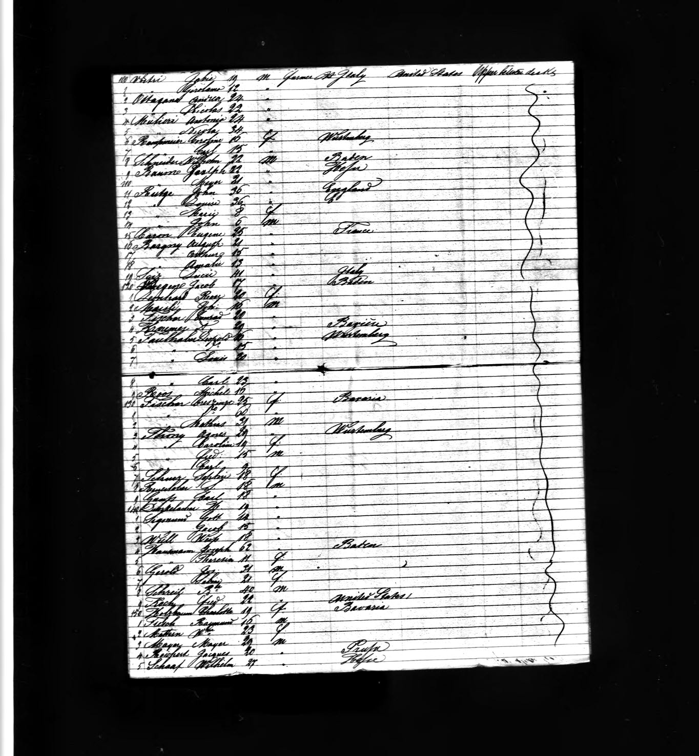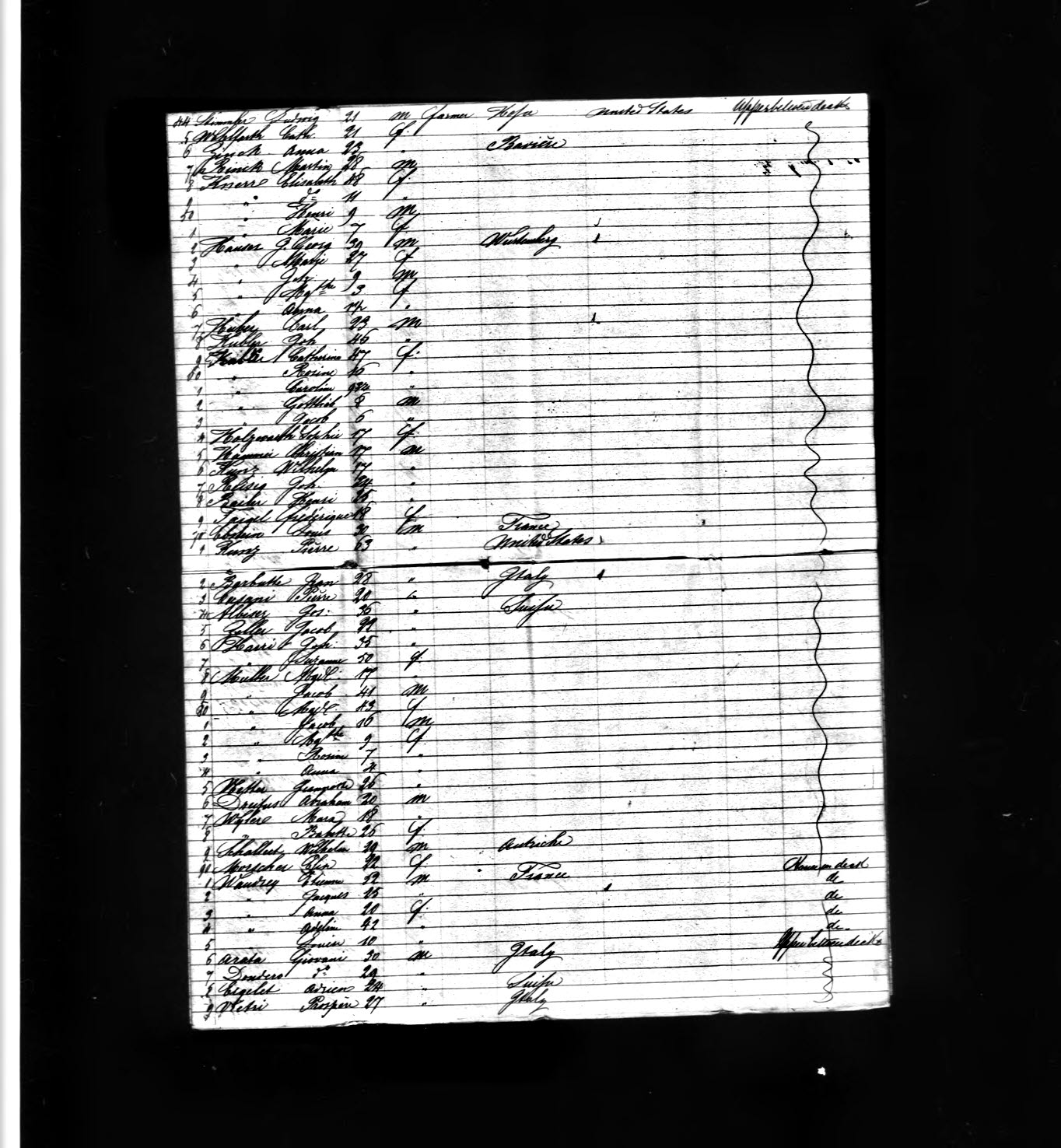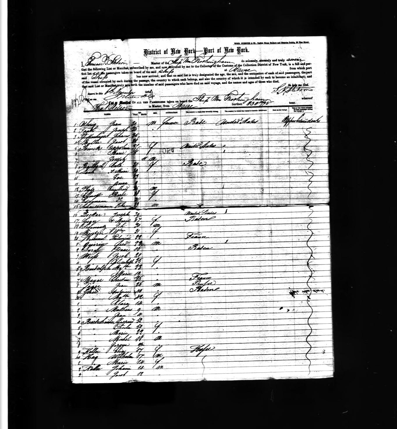 Here are four images, representing four pages (left to right, 1, 2, [next row] 3 and 4) of a ship manifest for the ship Wm. Frothingham, which arrived in the Port of New York on 6 Nov 1858. John ans his family appear as entries 11-14 on page 3