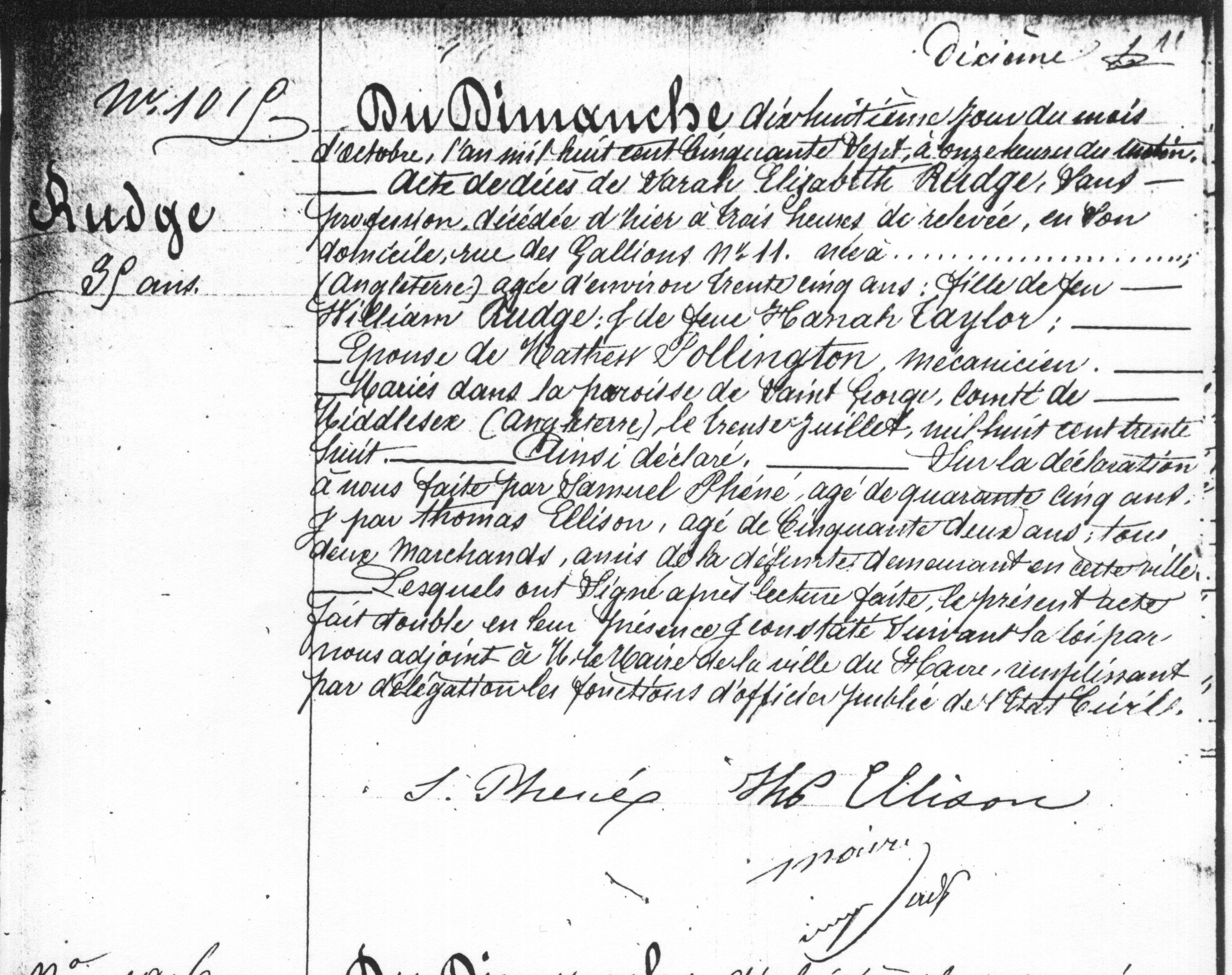 "No. 1015 Rudge 35 years old Sunday, the eighteenth day of the month of October, eighteen hundred fifty seven, at eleven in the morning. Certificate of the death of Sarah Elizabeth Rudge, no profession, deceased yesterday at 3 in the morning [?] at her home on Rue des Gallions no. 11, born on ... England, about 35 years old, daughter of the late William Rudge and the late Hannah Taylor. wife of Matthew Pollington, engineer, married in the Parish of Saint George, County of Middlesex, England the thirtieth of July, one thousand eight hundred thirty eight. Thus declare. On the declaration made to us by Samuel Phene, age forty-five years old, and by Thomas Ellison, age fifty-two years old, two merchants, friends of the deceased, residing in this town, After it was read, they signed the present act completed in their presence, certified according to the law by by us, adjunct to the provisional mayor of the town of Le Havre, and completed by the delegated functions of the pubic officer of the state. S. Phere Thos. Ellison Maire"