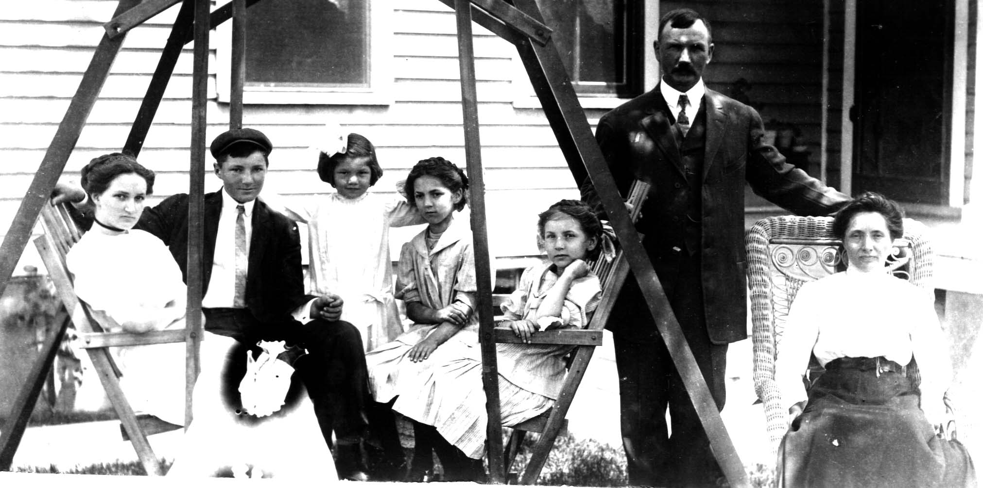 Here's a photograph of Alfred and Suzanne nee BIERI WYSS' family. The participants in this photograph are, left to right: Olive WYSS, Leo WYSS, Milda WYSS, Esther WYSS, Lena Anne WYSS, Alfred WYSS, and Suzanne nee BIERI WYSS.