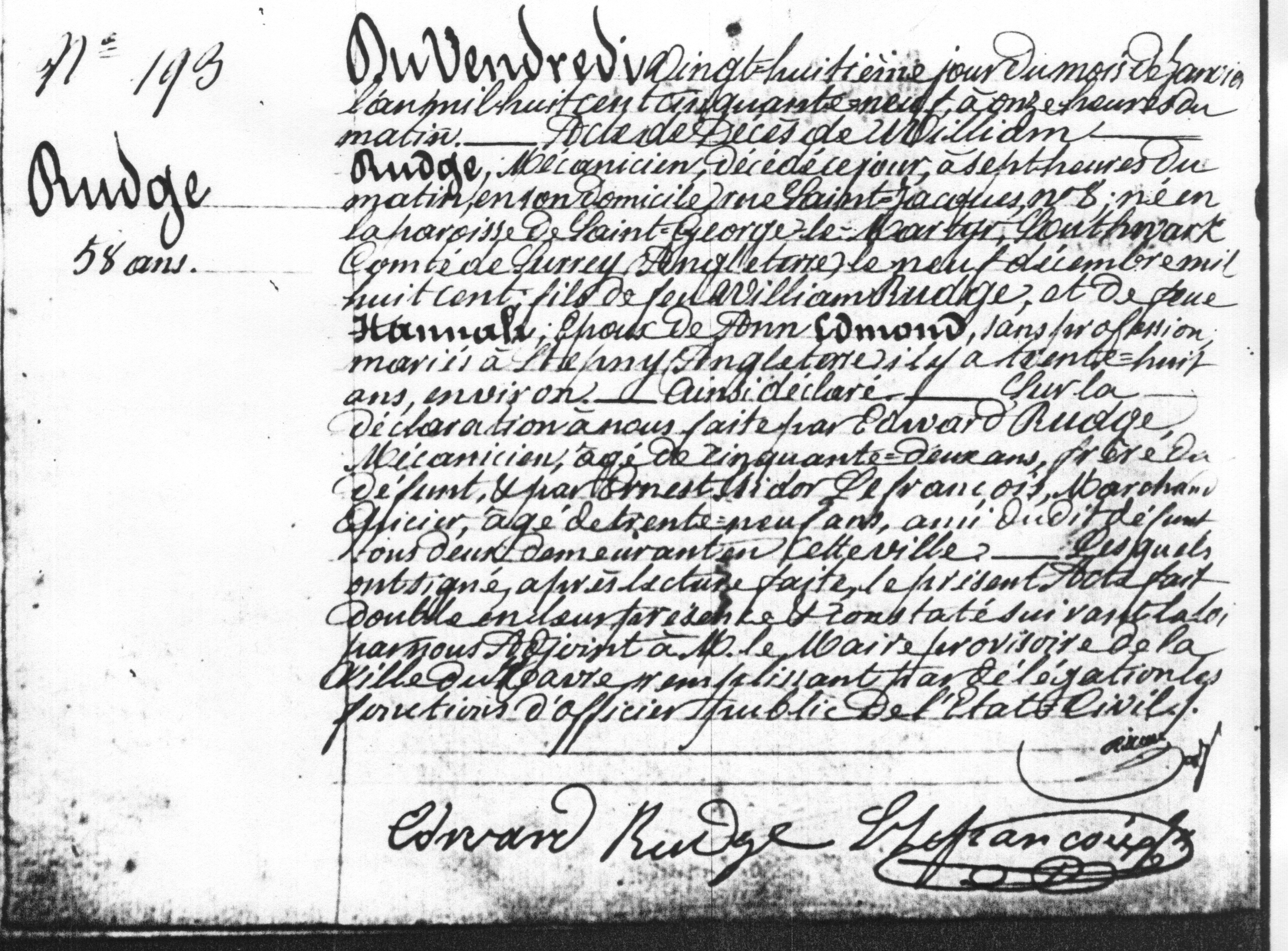 "No. 193 Rudge 58 years old Friday, the twenty-eighth day of the month of January, one thousand hundred fifty nine, at eleven in the morning, the death of William Rudge, engineer, deceased this day at seven o'clock in the morning at his home on Saint Jacques Street No. 8, born in the parish of Saint George the Martyr, Southwark, county of Surrey, England, the ninth of December, one thousand eight hundred, son of the late William Rudge and the late Hannah, husband of Ann Edmond, no profession, married in Stepney, England for about thirty eight years. Thus declared on a declaration given to us by Edward Rudge, engineer, age fifty-two years old, brother of the deceased, and by Mestsidor le Francois, shopkeeper officer, age of thirty nine years, all friends of the deceased, living in this town. After the reading, they signed the present act together in their presence and certified according to the law by us. Adjunct to the provisional mayor of the town of Le Havre, and completed by the delegated functions of the pubic officer of the state. Edward Rudge Lemaredeal