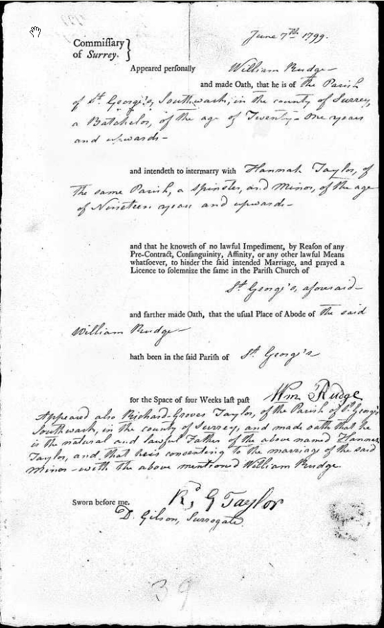 This is an image of the marriage bond for William Rudge's marriage to Hannah Taylor.